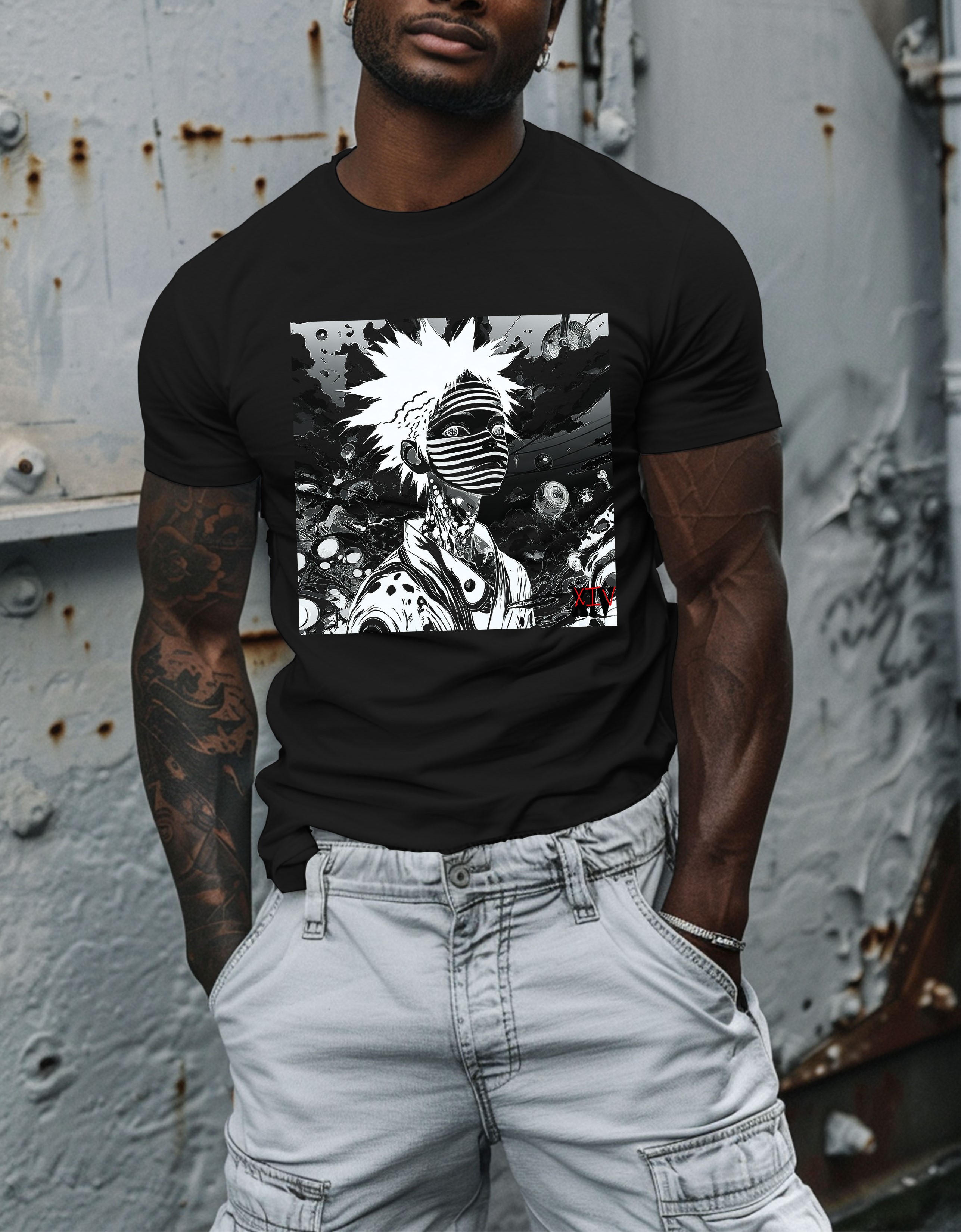 Unique black-and-white anime-inspired T-shirt featuring a striped-faced character in a surreal, otherworldly setting. Perfect for bold streetwear fans.